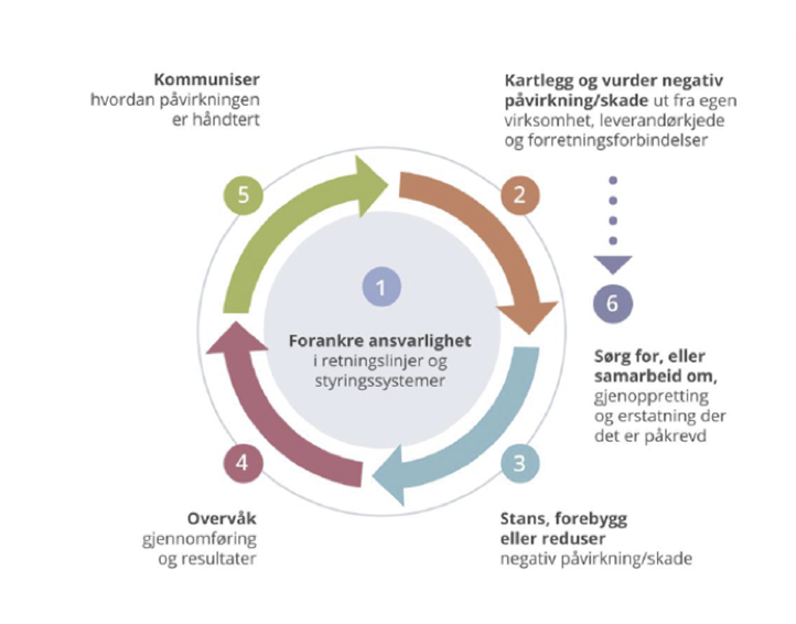 Vi har utarbeidet et organisasjonskart som definerer ansvar og mandat og et årshjul som viser hvordan vi skal jobbe med aktsomhetsvurderinger gjennom året. Ledelse og styret har også vedtatt vår Code of Conduct som er i henhold til OECD sine retningslinjer.