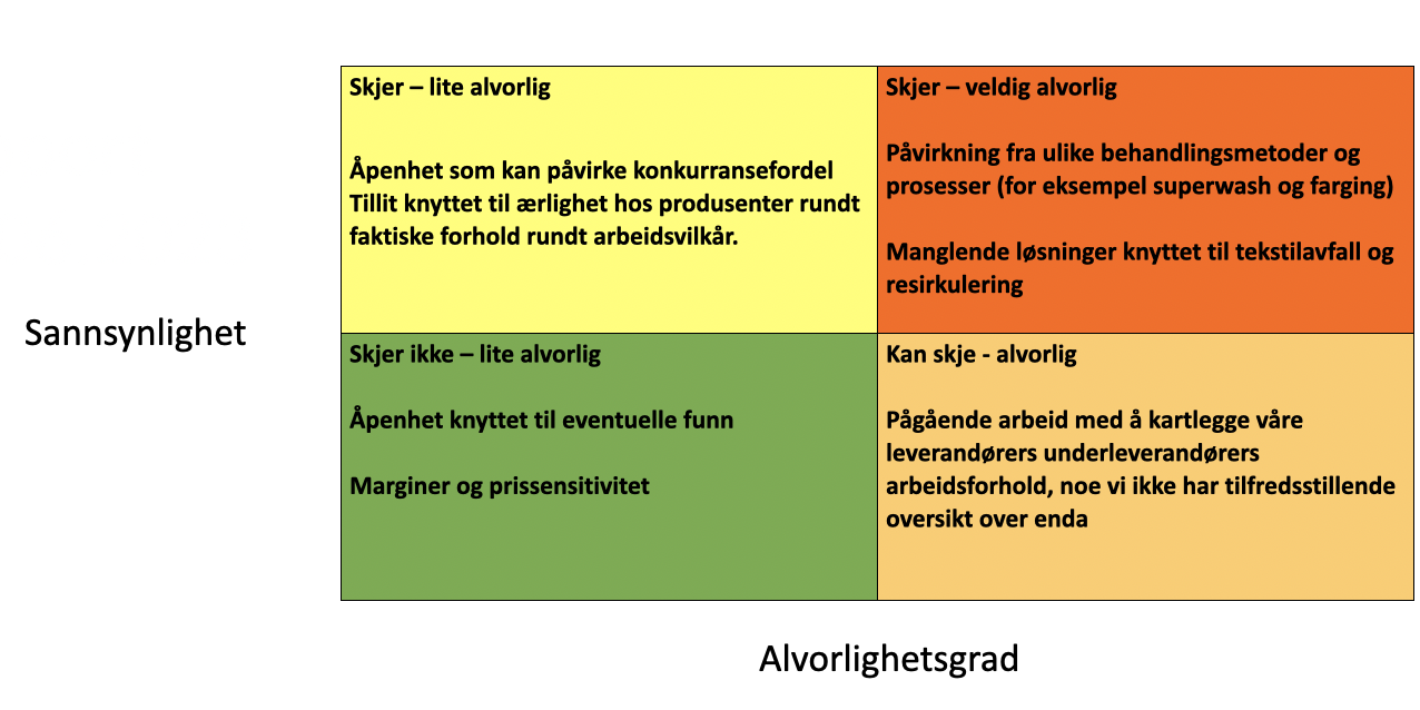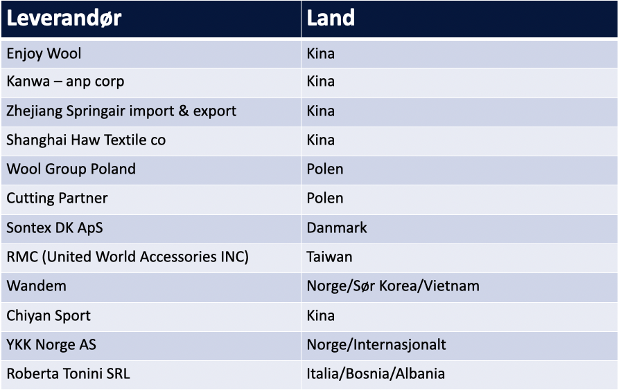 I risikovurderingen av verdikjeden har vi gjennomgått alle våre leverandører med tanke på hvilket land det operer i, produksjonsprosesser og hvilke innsatsfaktorer de leverer. Vi har lenge hatt fokus på forholdene i våre leverandørers fabrikker og deres underleverandører, men arbeidet med informasjonsinnhenting er en kontinuerlig prosess. Vi har et godt samarbeid med våre leverandører og har fått god informasjon fra de fleste. Vi har gått igjennom mottatt informasjon og har fulgt opp med videre spørsmål der vi vurderte det som nødvendig.