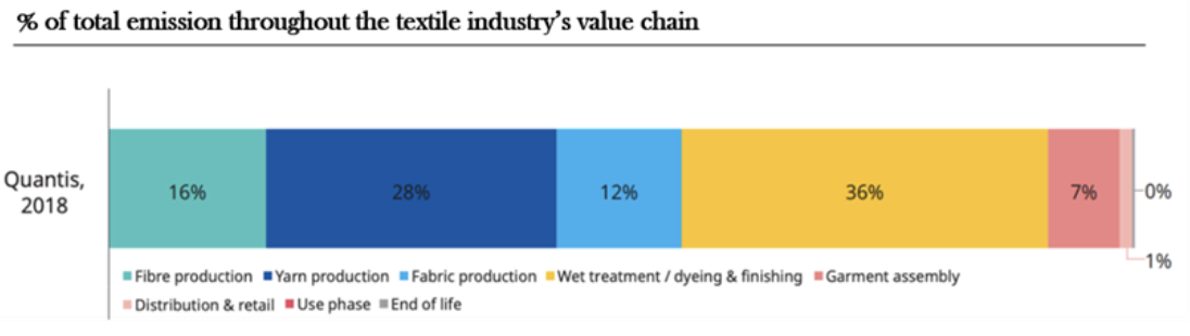 Vi har gjennomført et arbeid med å finne ut hvor i verdikjeden vi etterlater størst fotavtrykk, samt hvor vi har mulighet til å redusere fotavtrykket ved å ta bedre beslutninger. I følge en studie gjort av Quantis i 2018 er det følgende fordeling av utslipp i verdikjeden i tekstilindustrien: