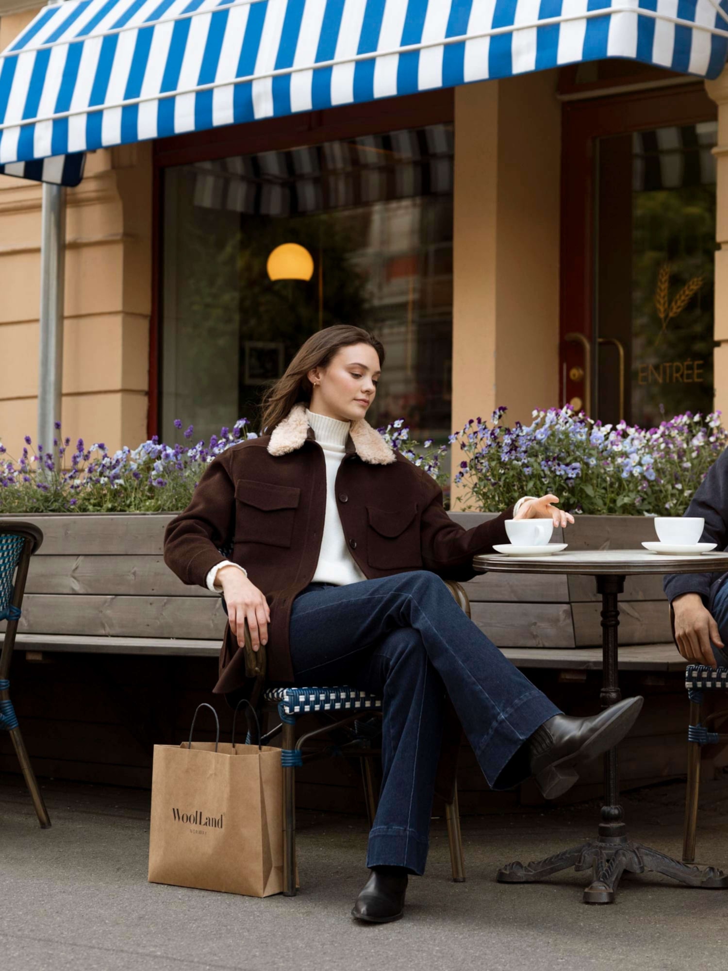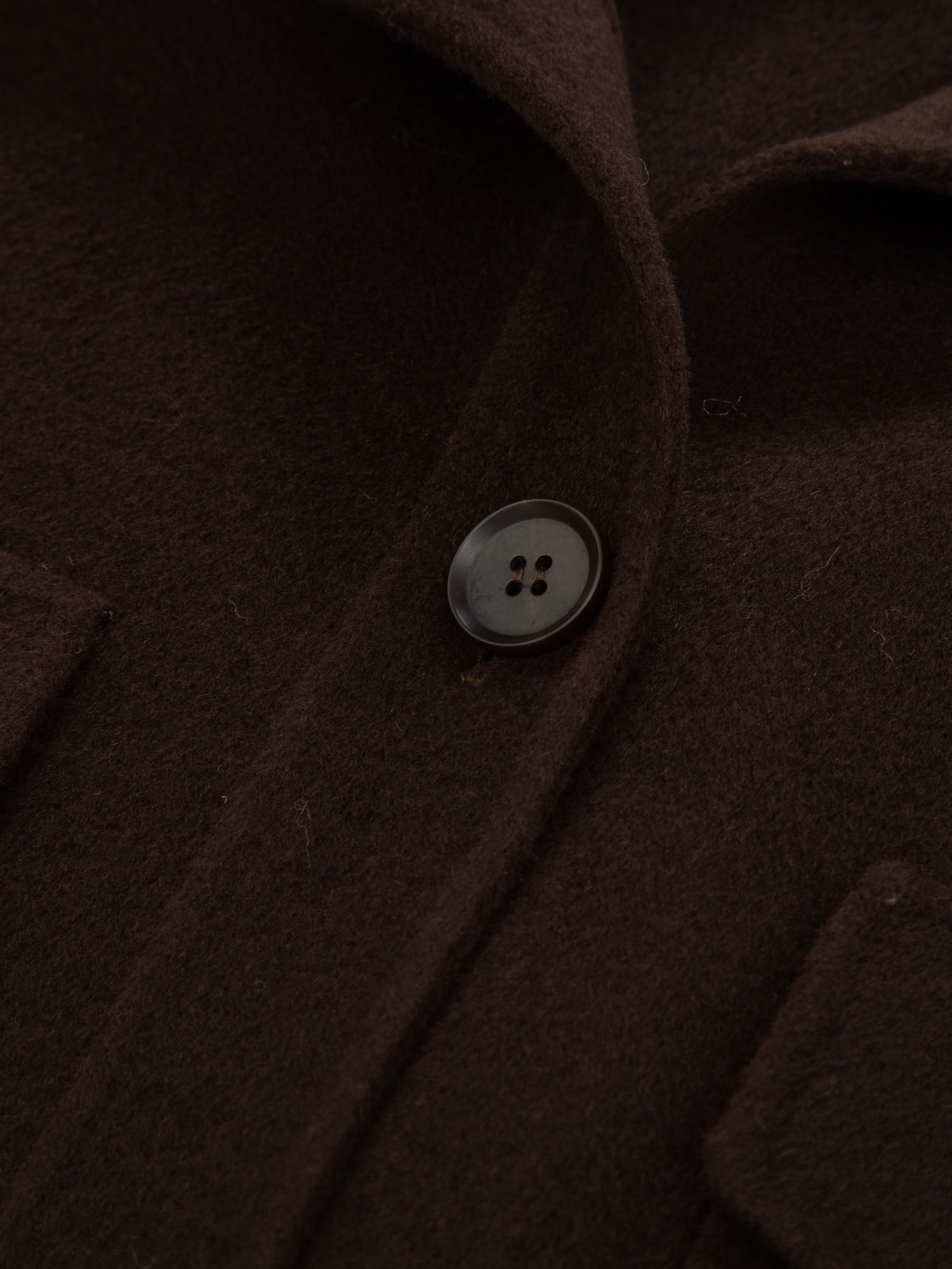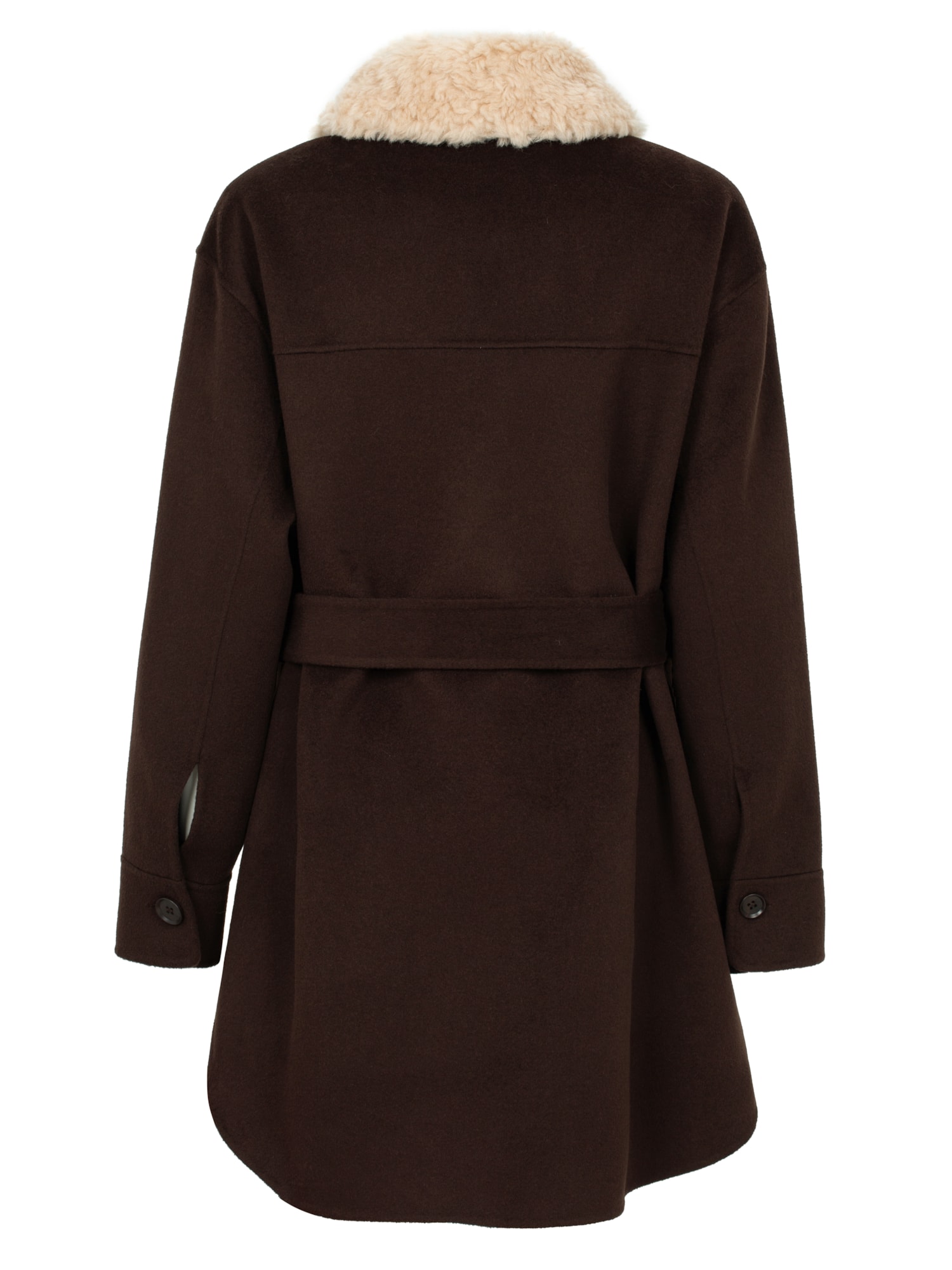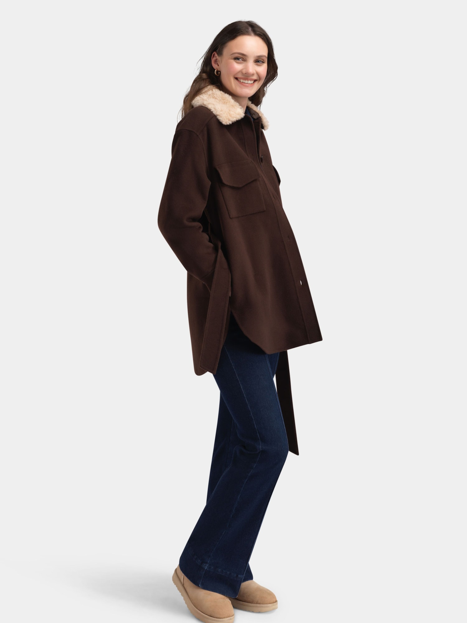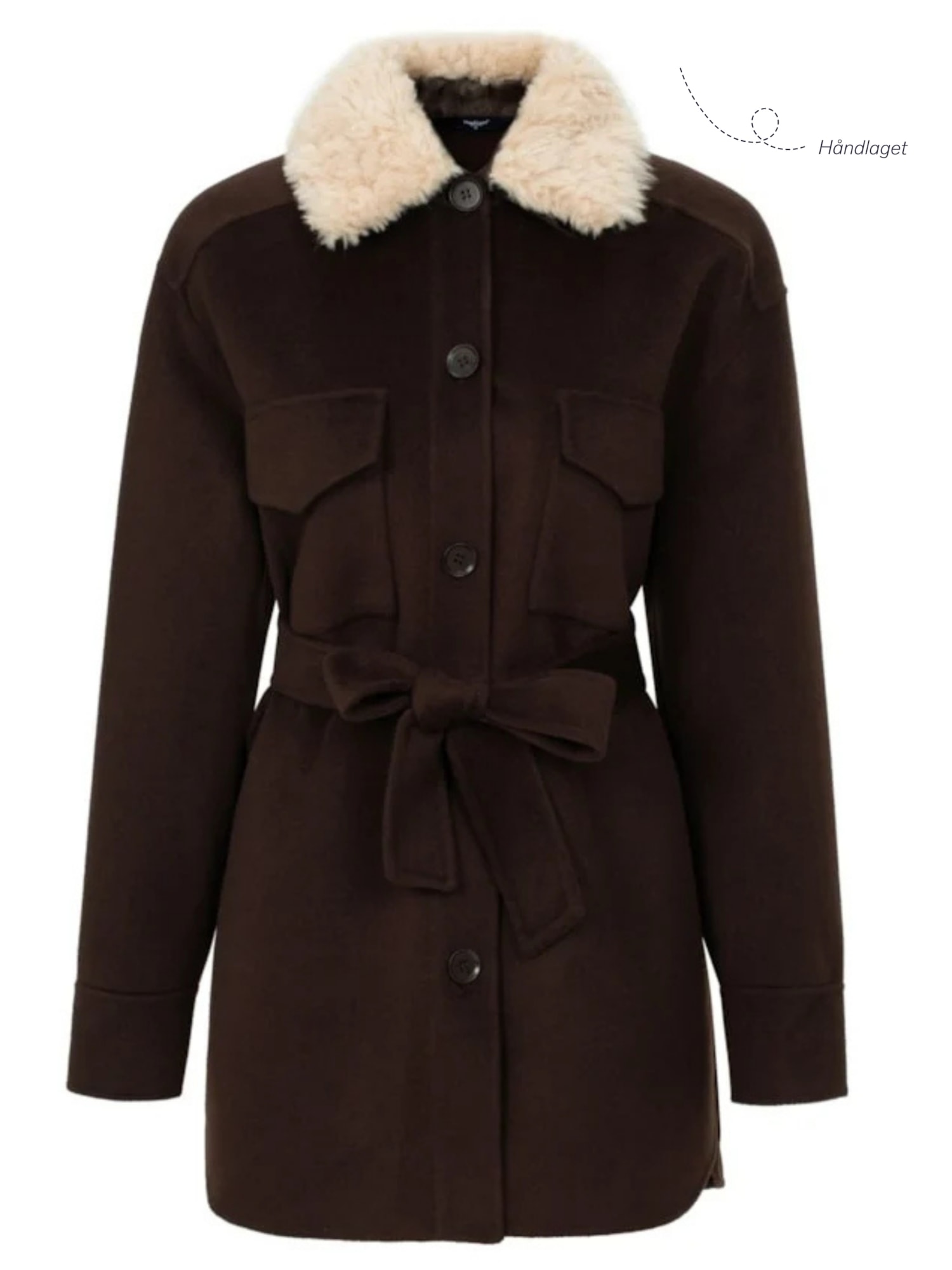Skålatårnet jakke er en elegant ytterjakke til dame designet som en skjorte. Den er laget av en luksuriøs blanding av 90% ull og 10% kashmir for optimal varme og komfort. Jakken er utstyrt med et belte i livet, bryst- og sidelommer for både funksjonalitet og design. Den har også en avtagbar pelskrage i 100% lammeull, som gir ekstra varme og et stilig preg.